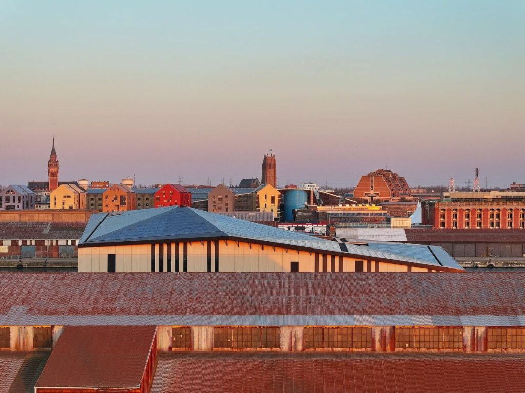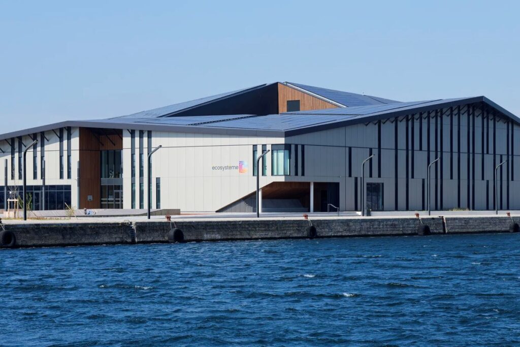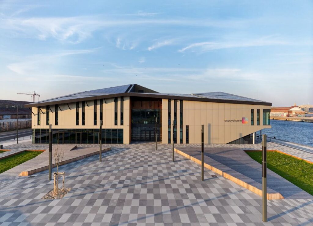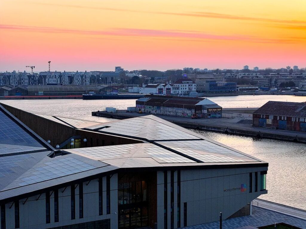 Within the context of Dunkirk’s port landscape, Écosystème D appears as a building that combines technical innovation with urban narrative. It is a positive energy building, meaning it produces more energy than it consumes, and thus places itself at the forefront of France’s energy transition initiatives.